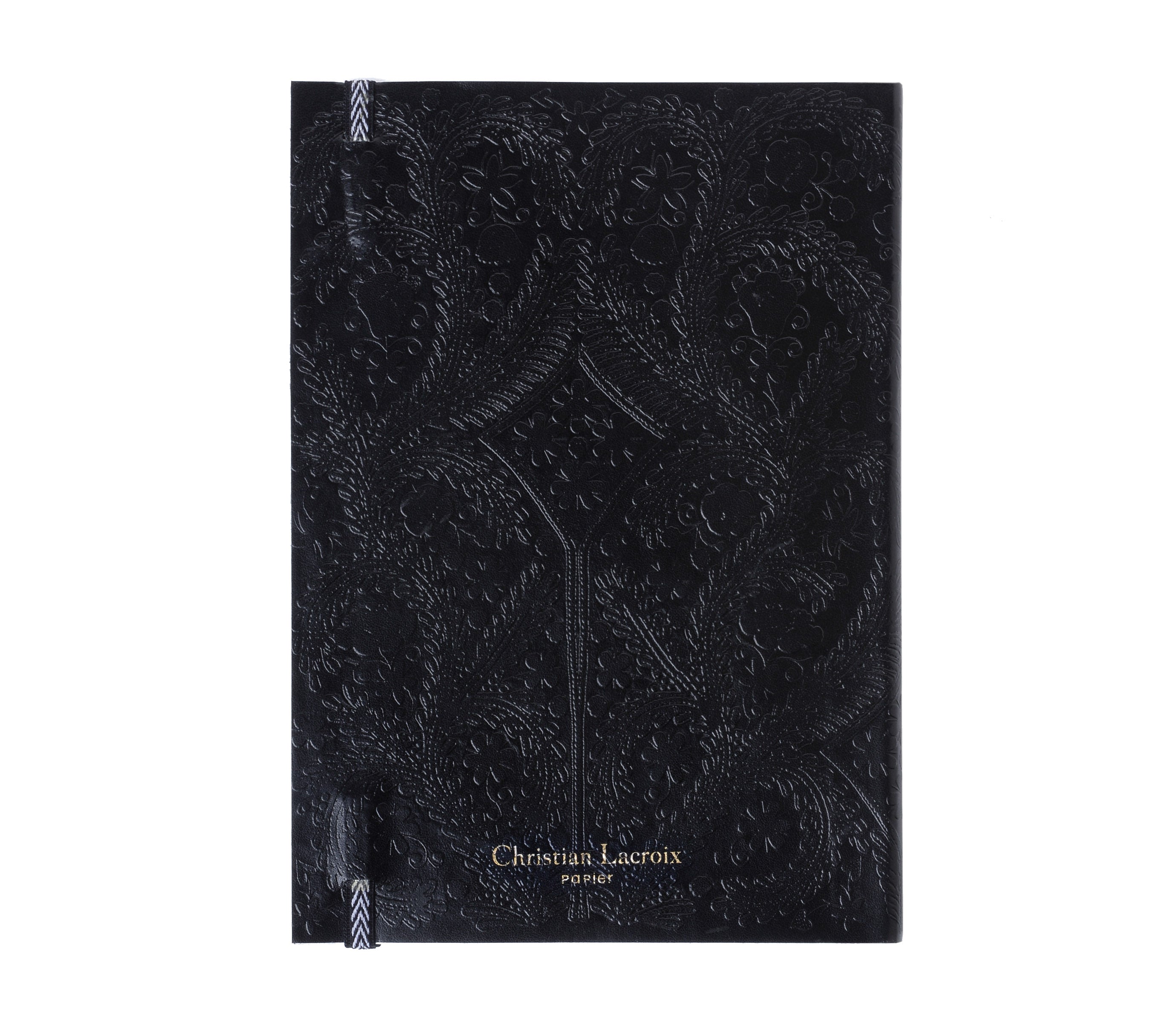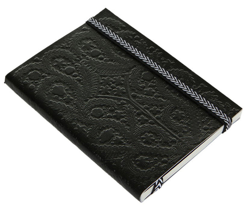 This notebook is embossed with the famous Paseo design on beautiful faux leather. Includes a striped elastic closure and ribbon marker with a lay-flat construction for ease of use.